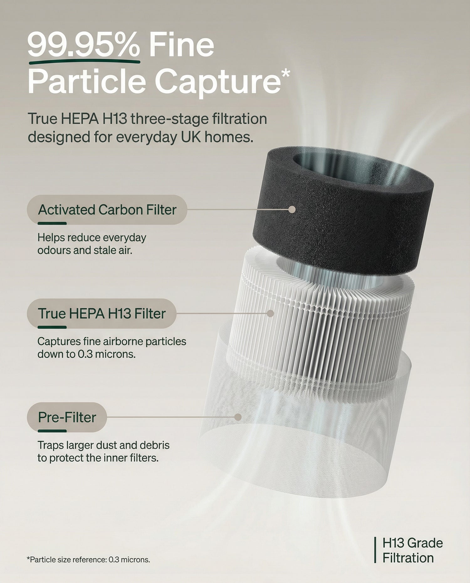 While it is not a medical device, some UK customers with hay fever, dust sensitivities, or breathing sensitivities say they notice less irritation — particularly in the evening and at night. Fewer airborne particles circulating means a more comfortable environment while you sleep.